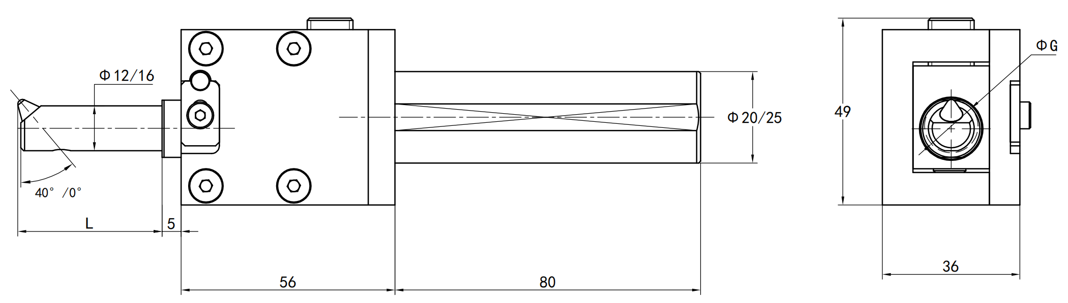 | 工具型號 | 角度 | 鏜刀桿尺寸 | 最小加工孔徑 | 安裝柄徑 |